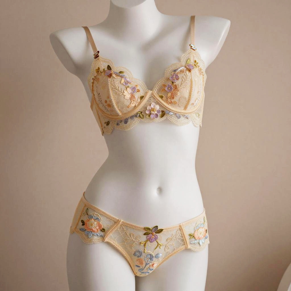 Princess Belle lingerie inspired delicate lace set, golden yellow and soft pastel tones, intricate floral embroidery, ethereal soft lighting, elegant and romantic mood