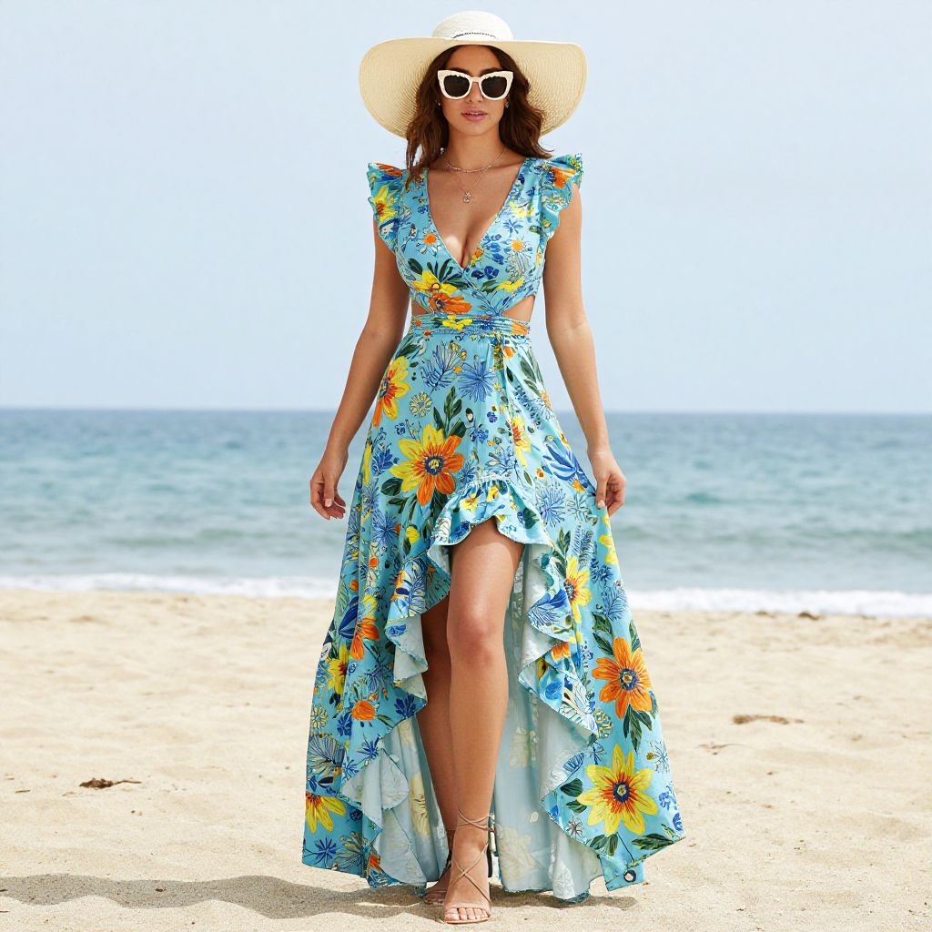 Photograph of a woman standing on a sandy beach with the ocean in the background. She wears a vibrant, blue floral dress with a deep V-neck and ruffled, asymmetrical hem. The dress features large sunflower and daisy prints in yellow, orange, and white. She has on white, oversized sunglasses and a wide-brimmed, white sun hat. Her long brown hair is loose, and she wears strappy, beige high-heeled sandals. The bright sunlight casts soft shadows, enhancing the beach's serene, clear blue sky and calm ocean. The woman's confident stance and stylish outfit exude a summery, beach-ready vibe.