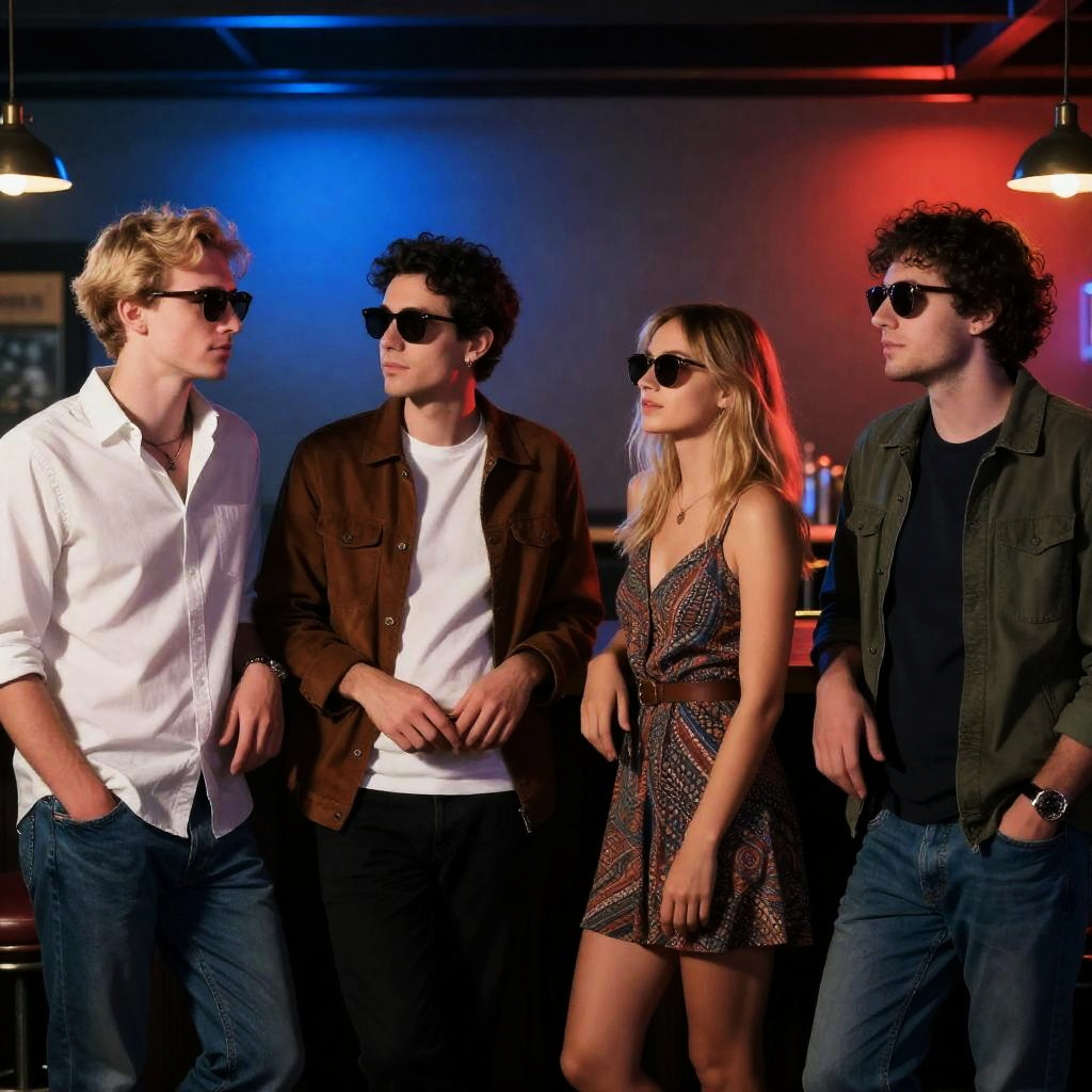 Photograph of four people in a dimly lit, neon-lit bar. Four individuals with varied appearances: blonde man in white shirt and sunglasses, dark-haired man in brown jacket and sunglasses, blonde woman in patterned dress and sunglasses, curly-haired man in green jacket and dark shirt. All standing or leaning on bar counter, facing left. Neon blue and red light reflections on ured wall background. Bar counter and stools visible. Casual, cool, relaxed atmosphere.