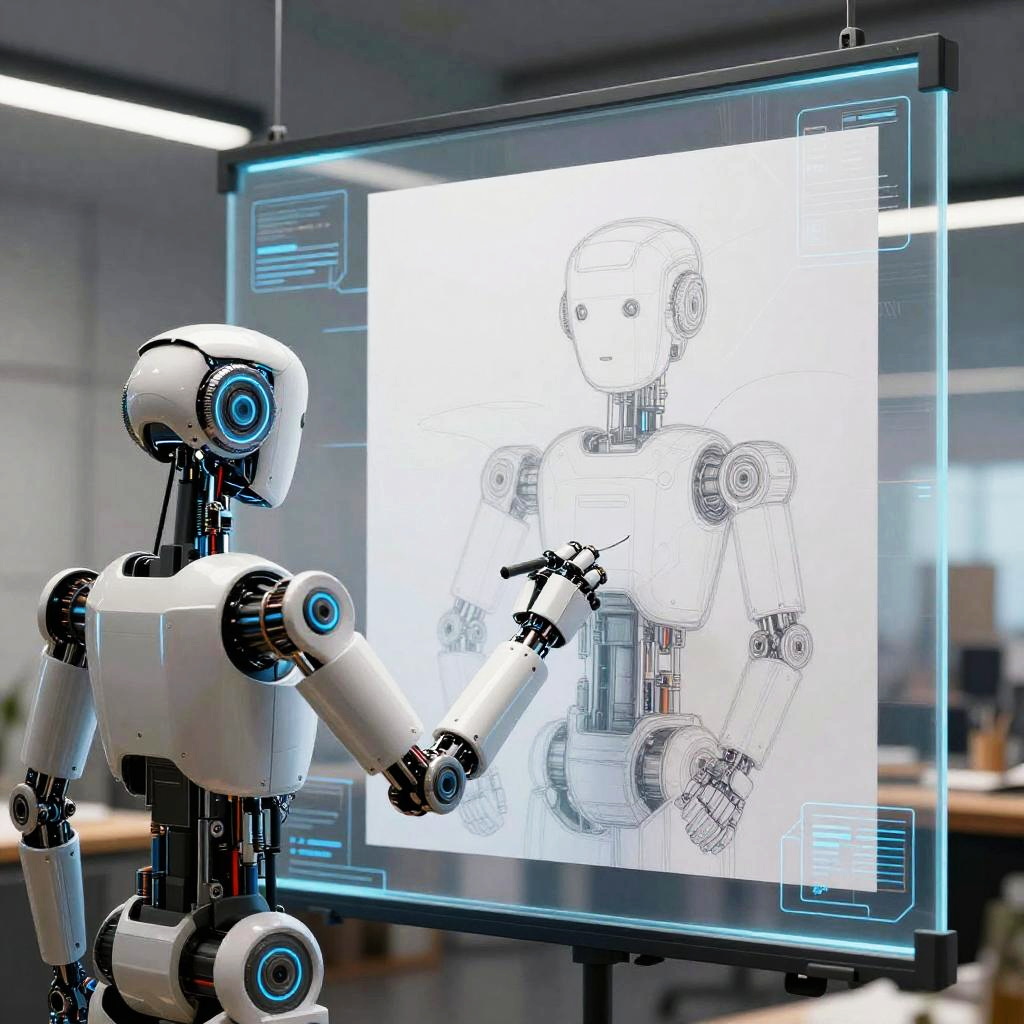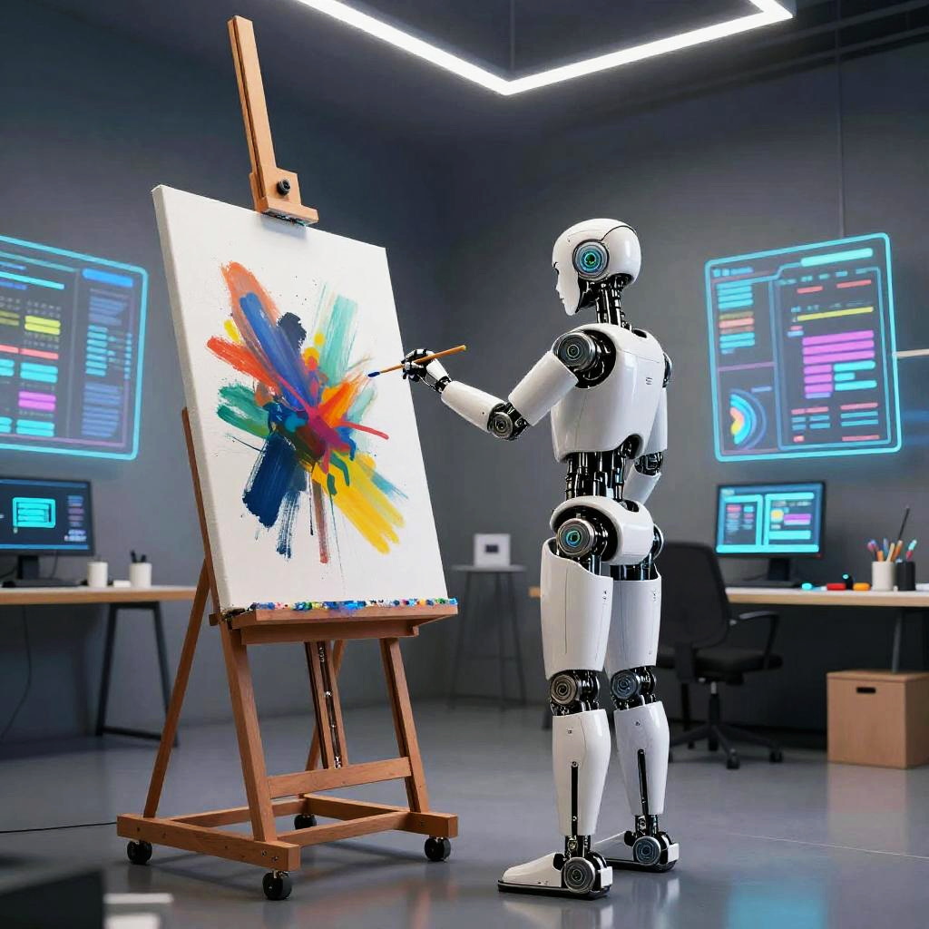 AI that makes pictures illustrating robotic artists painting canvases in a studio filled with holograms, soft ambient light, futuristic interior design with metallic and glass surfaces, expressive brushstrokes rendered by digital creativity, high resolution and immersive environment