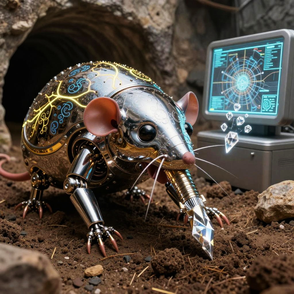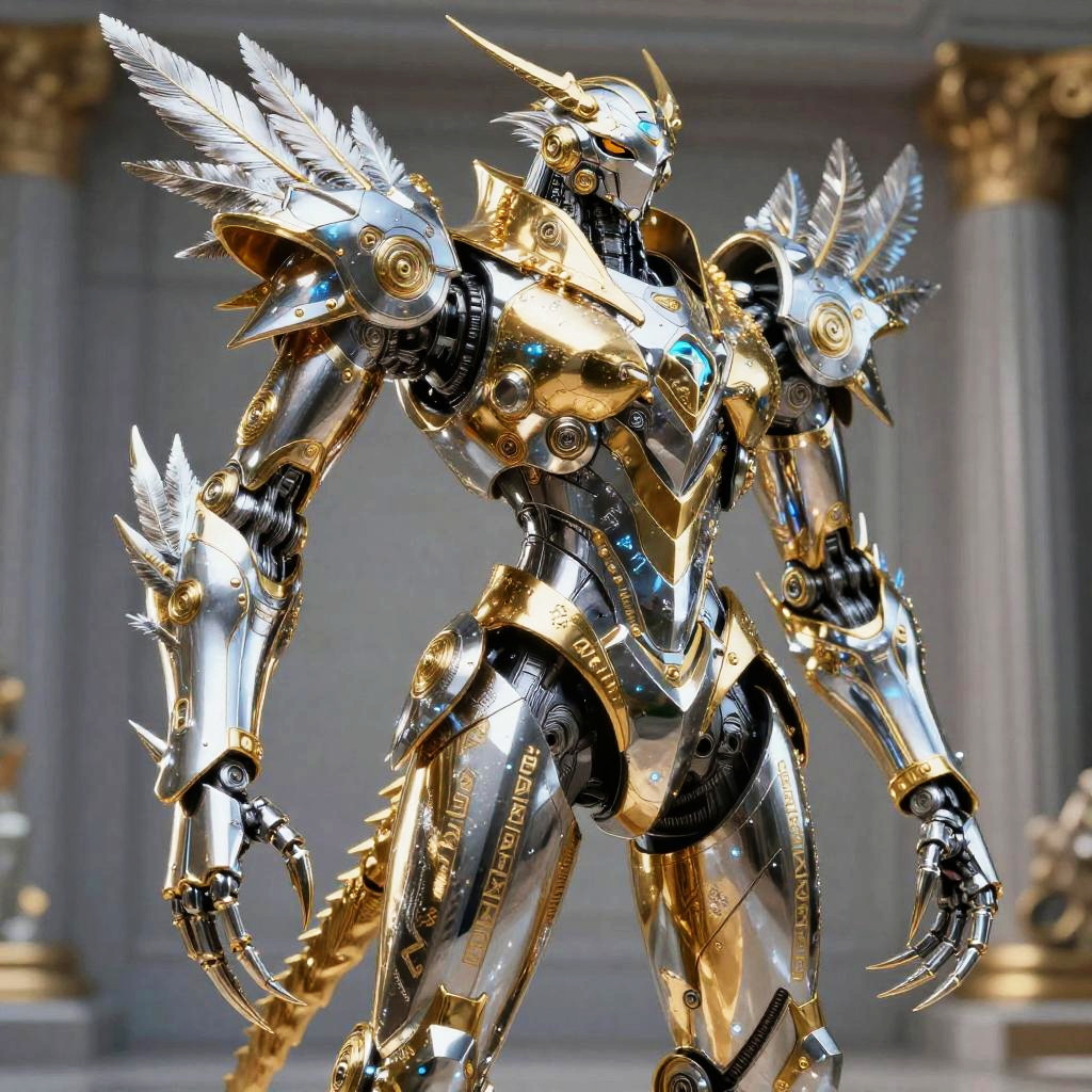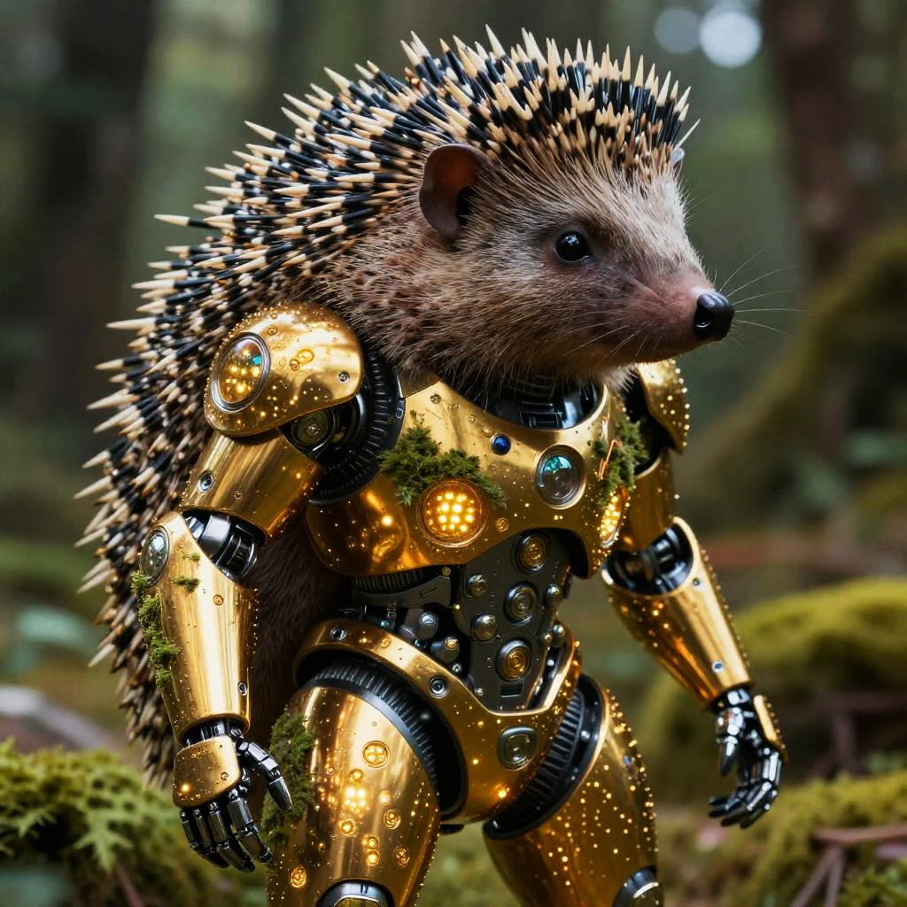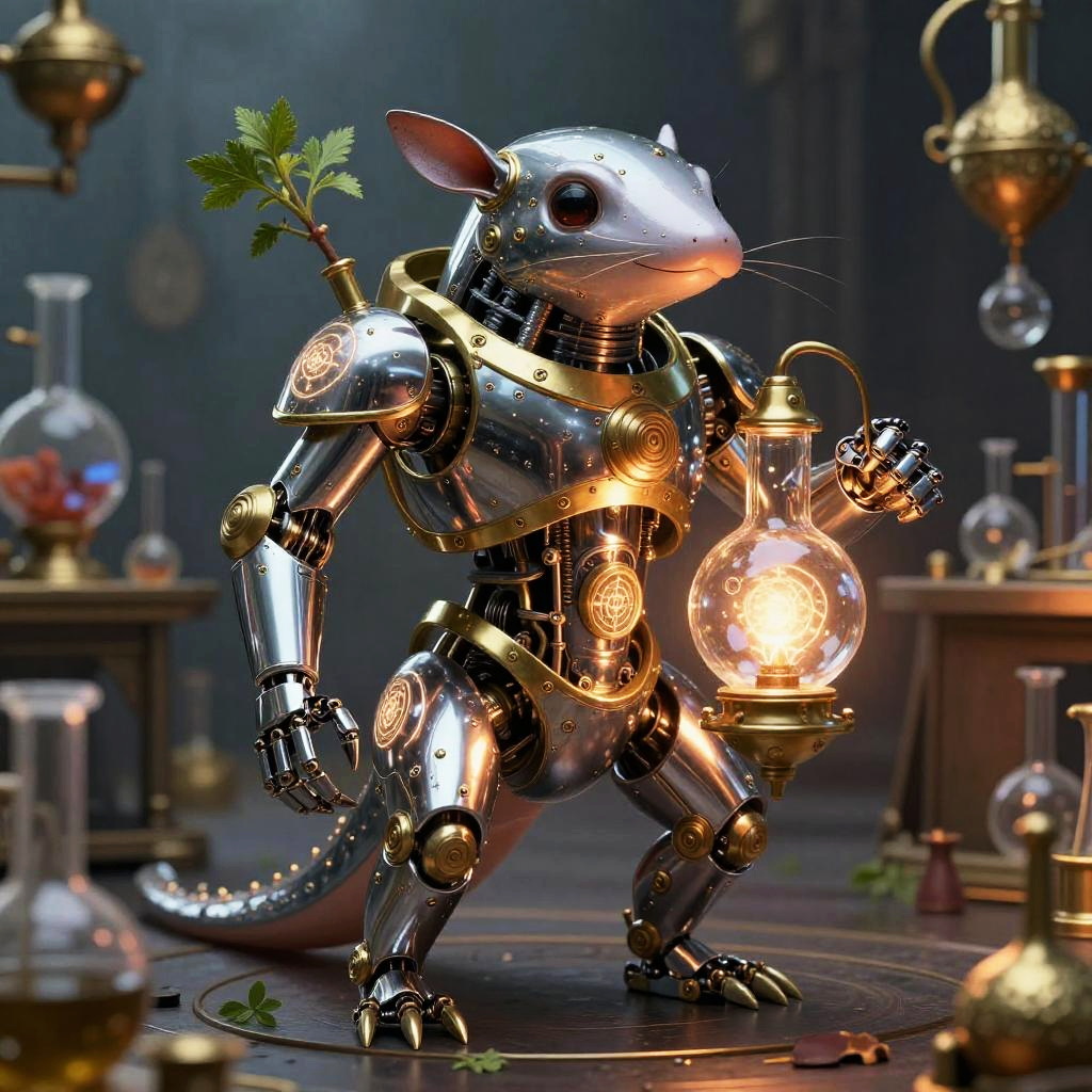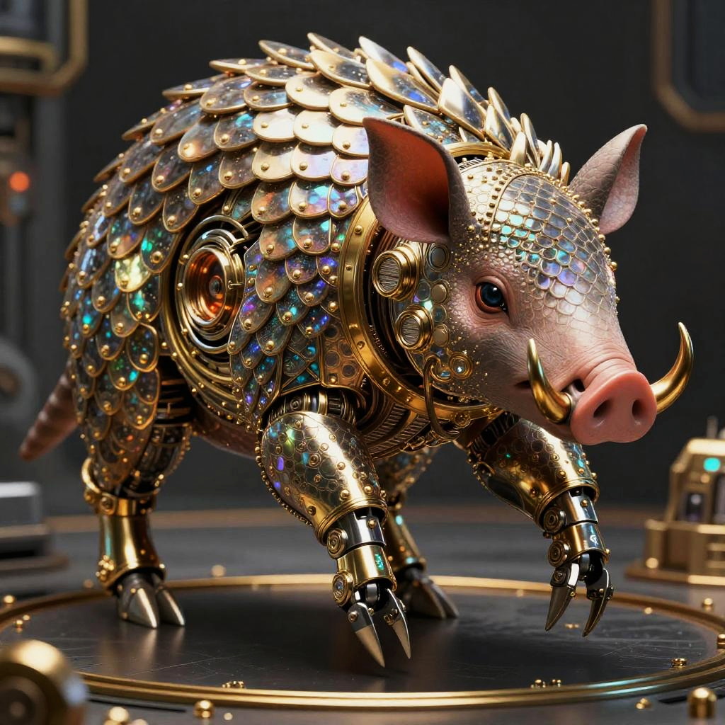 Stippling Anthropomorphic pangolin tinker in scale-integrated micro-forge exosuit with articulated keratin clamps, iridescent nano-scale plating, brass rivets, embedded lenswork and softly glowing annealing cores Sorayma science fiction fantasy illustration style, precisely detailed, highly detailed style as superrealism, hyper realistic, super shiny robot, chrome, shiny gold, smooth aesthetic, obsidian chamber background, High resolution. Photorealistic lighting, unreal engine 5,