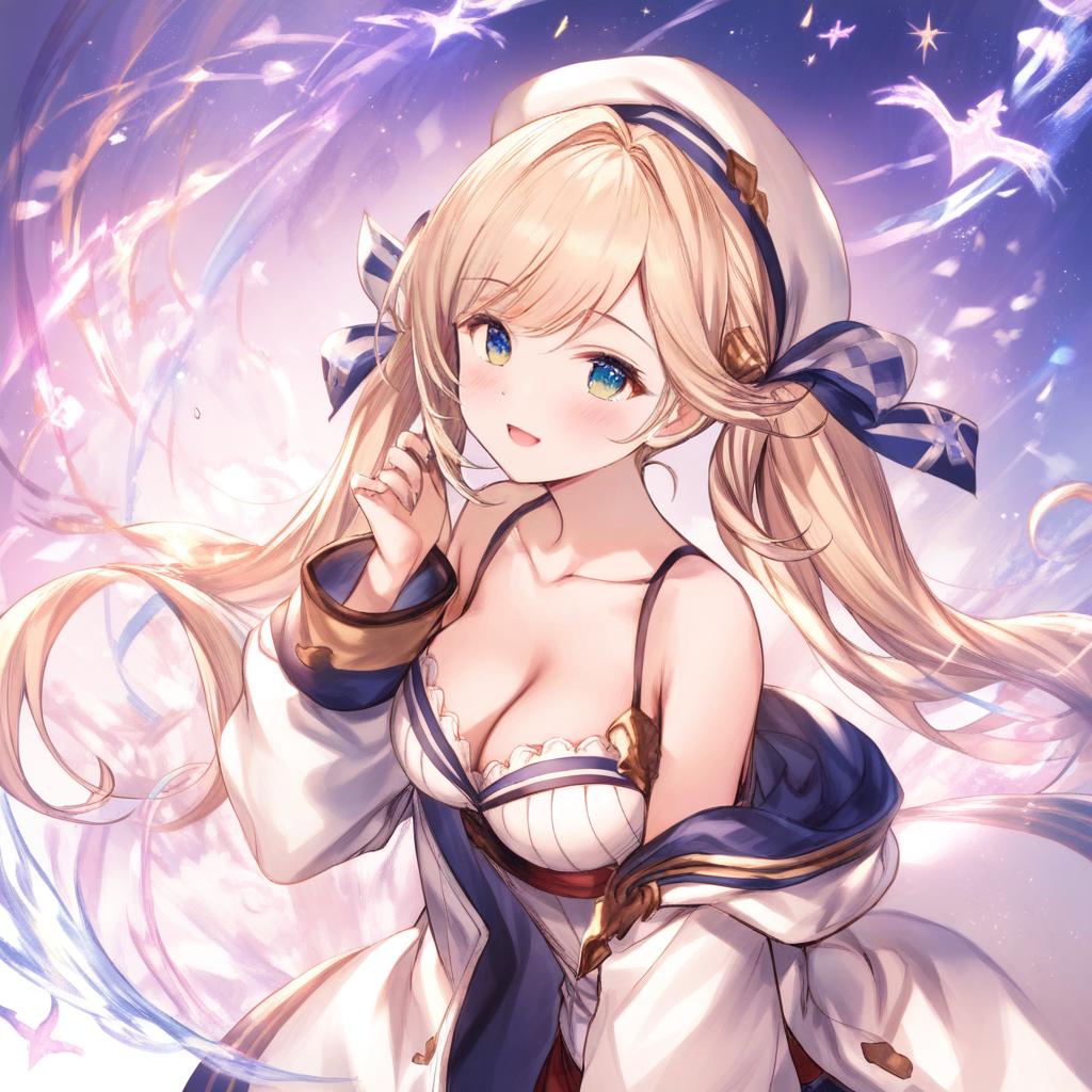 Cucouroux (granblue fantasy), granblue fantasy, 1girl, blue eyes, long hair, blonde hair, twintails, hair ribbon, medium breasts, large breasts, cleavage, collarbone, bare shoulders, long sleeves, beret, by artist komeshiro kasu, animagine