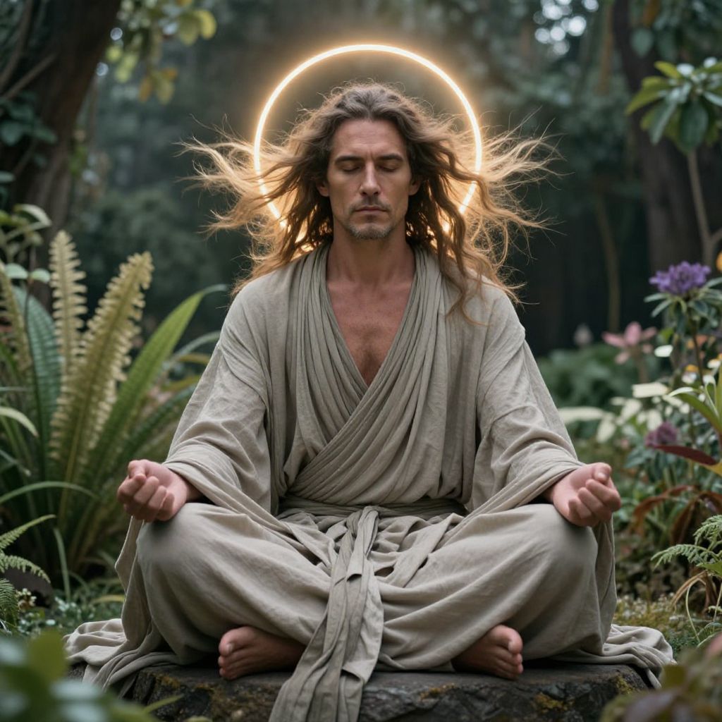 Photograph of a long-haired, Caucasian man with a rugged, bearded face, sitting cross-legged in a forest garden. He wears a loose, beige robe with a deep V-neck, revealing a slight hint of chest hair. His hands rest on his knees, palms up, in a meditative pose. A glowing, circular halo hovers behind his head, illuminating his flowing hair. The background features lush greenery, including ferns and purple flowers. The lighting is natural, with soft shadows, creating a serene and mystical atmosphere. The man's expression is calm and focused.