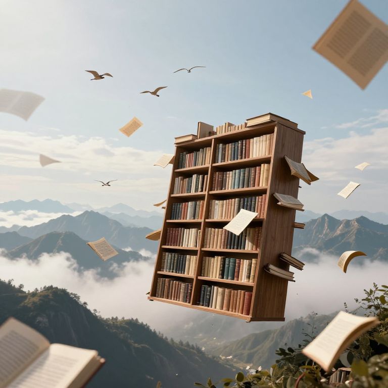 Floating wooden bookshelf filled with books and papers, surrounded by flying pages and birds, above misty mountain range. Digital art.