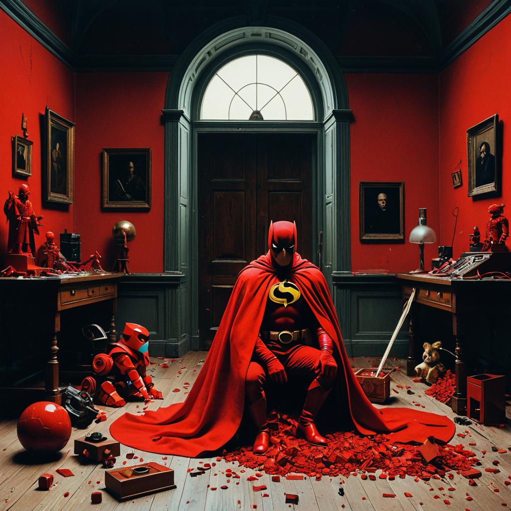 A striking image of a red-clad superhero with a cape seated in an elaborately decorated vintage room painted in deep red. The room features dark wooden floorboards scattered with broken red toys. Two wooden desks line the walls filled with red-themed artifacts and models. The superhero wears a red mask and suit with a yellow insignia on the chest amid framed dark portraits on the walls. The atmosphere reflects a mysterious and artistic style inspired by classical and surreal influences.