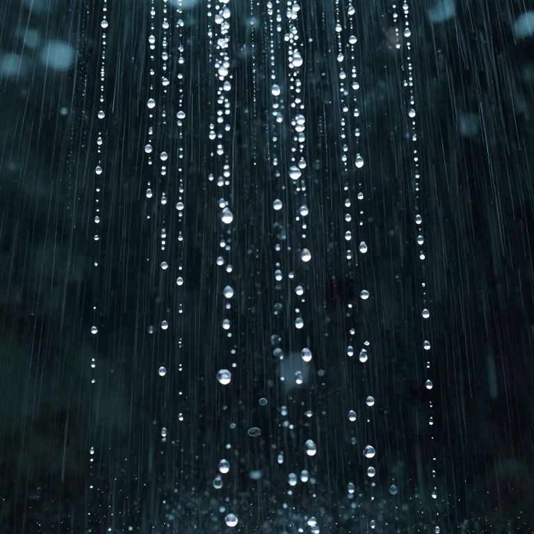 Photograph of raindrops illuminated against a dark blue background, creating vertical lines of sparkling white dots in a mesmerizing, ethereal pattern.