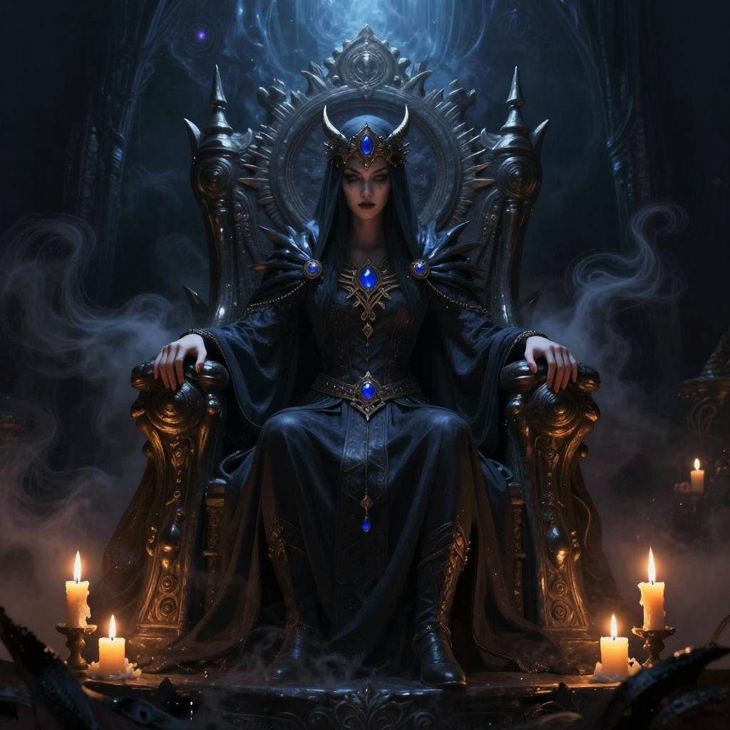 A realistic fantasy portrait of a mysterious shadow mage sitting on an intricately carved throne. The mage wears dark, elaborate robes adorned with glowing blue gemstones and a crown with horns. The scene is surrounded by swirling dark mist and flickering candles, creating an ethereal and mystical atmosphere with vibrant colors and radiant lighting.