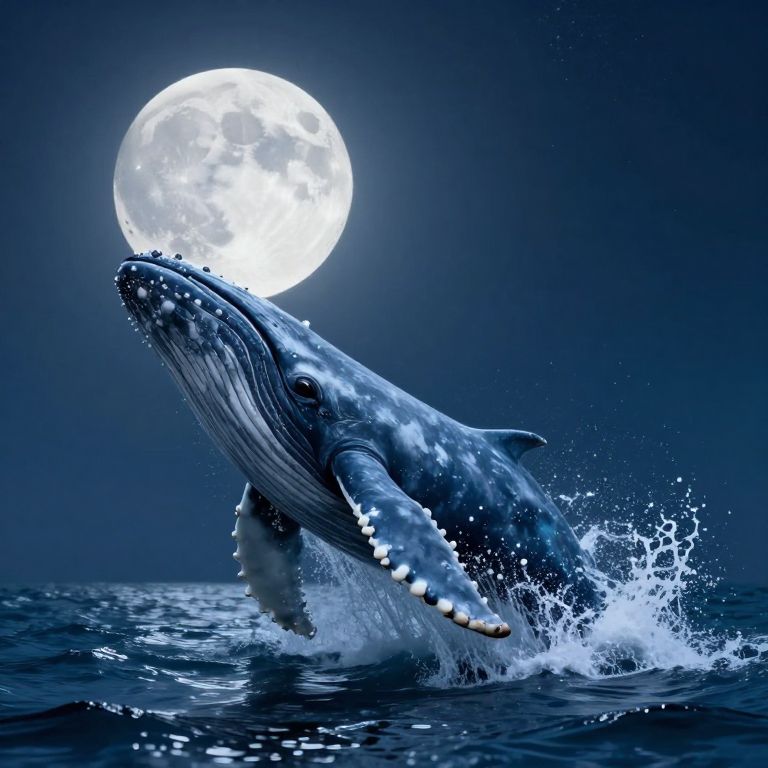 Photorealistic digital art of a leaping humpback whale under a full moon, splashing in dark blue ocean water, with intense white moon