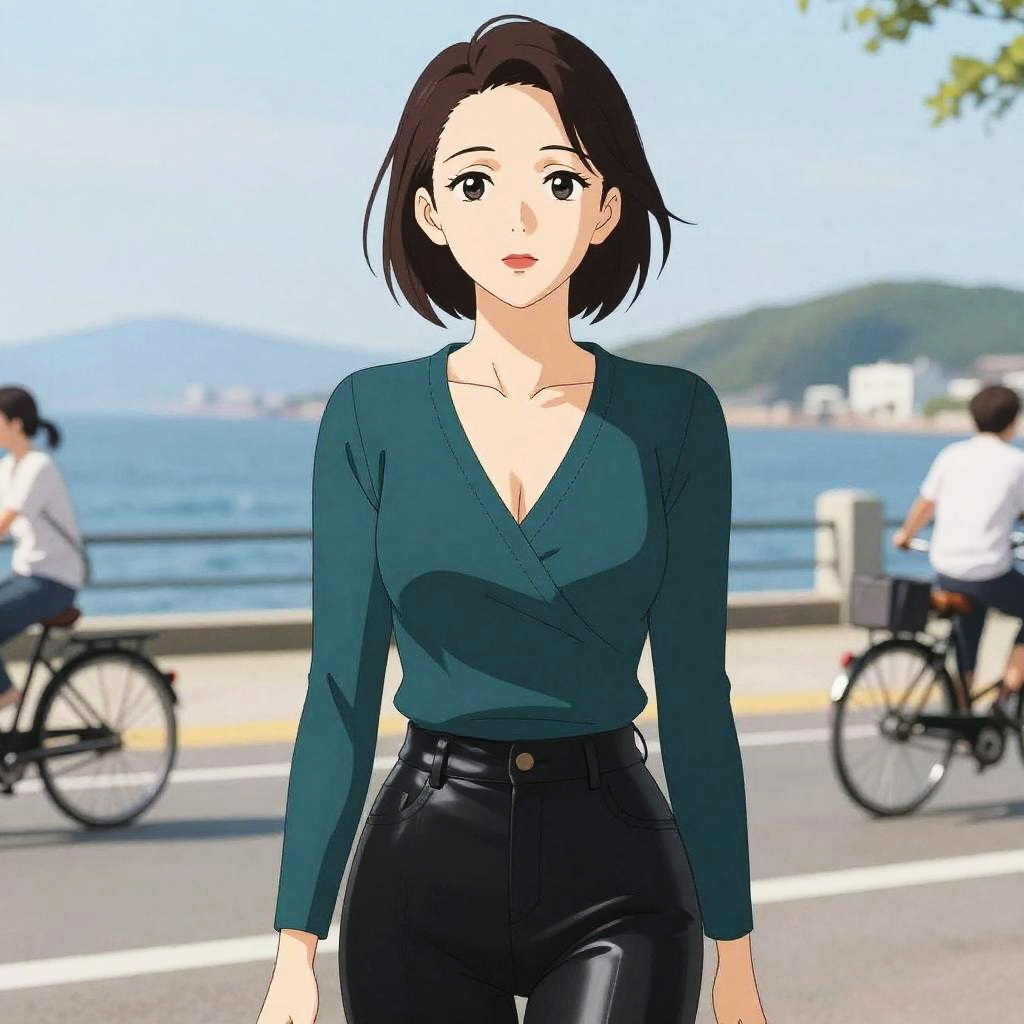 A woman, in a contemporary chic style, wearing a sky blue bodycon mini dress with long sleeves and nude strappy heels, set against the vibrant backdrop of a street parade in Tokyo, illustrated in the visual style of Kyoto Animation. Sexy. Pretty face and beutiful eyes