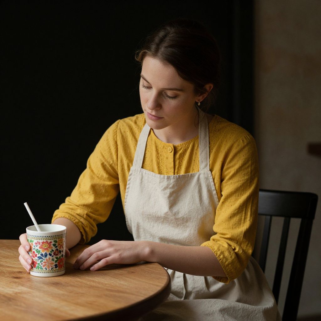 Woman writing intently at a wooden table, illuminated by soft light, wearing a mustard-yellow dress with a cream apron, her hands resting near a floral-patterned mug and a straw, set against a dark background with a textured wall to the right.