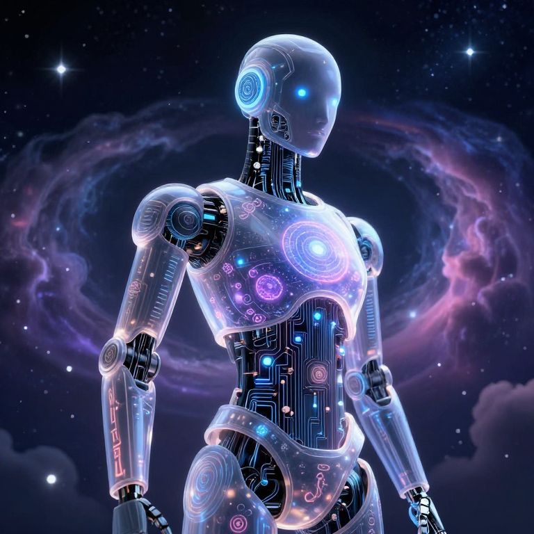 Digital artwork of a futuristic, humanoid robot standing against a cosmic background. The robot is semi-transparent with glowing blue and purple neon lights outlining its metallic joints and circuits. Its head is smooth and featureless, while the torso, arms, and legs are detailed with intricate circuitry. The background features a dark, star-studded sky with swirling clouds of purple and pink hues, adding a sense of depth and otherworldliness. The robot's luminescent lights create a striking contrast with the dark, celestial backdrop, emphasizing its futuristic and robotic nature.