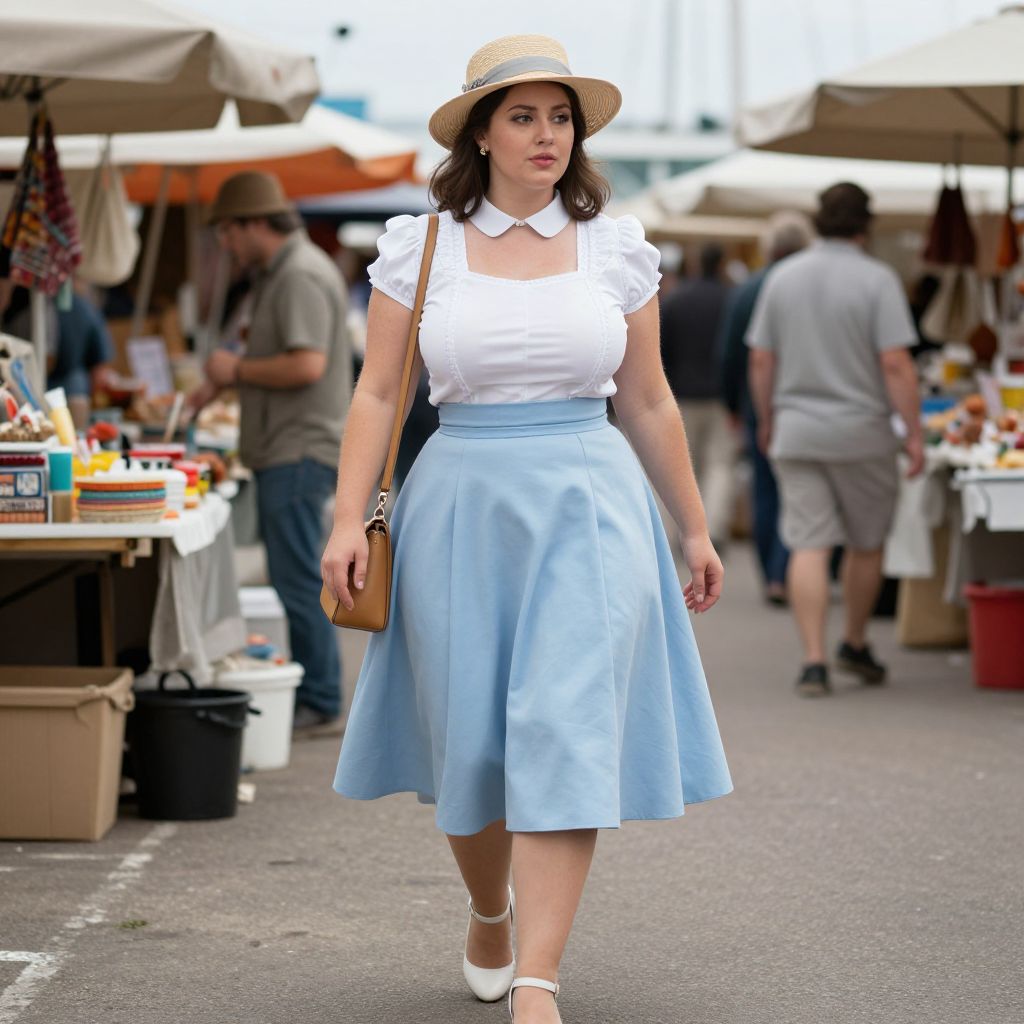 A Stocky woman, vintage-inspired, white short-sleeved blouse with ruffle detail and Peter Pan collar, high-waisted pale blue circle skirt, tan shoulder bag, white heels with ankle straps, beige straw boater hat with ribbon, bustling harbor market. Knee level shot, cctv, daylight Sexy. Pretty face and beаutiful eyes. Big breasts