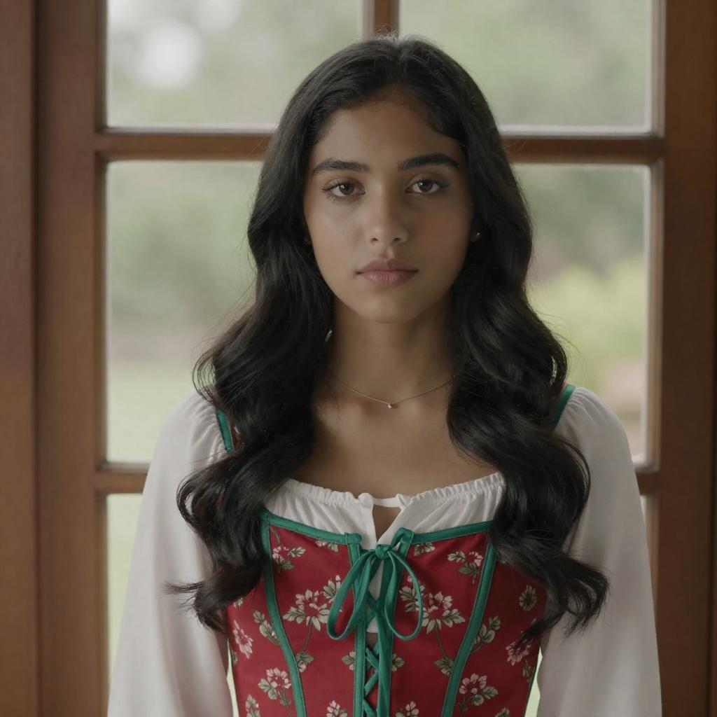 Photograph of a young woman with long, wavy black hair and olive skin, wearing a white blouse over a red corset with green laces and floral patterns. She stands in front of a wooden-framed window, with blurred greenery outside. She has a neutral expression and wears a simple necklace.