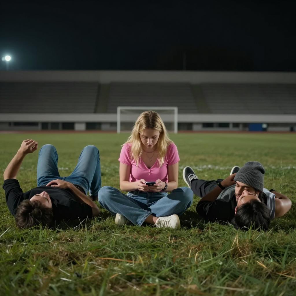 Nighttime photograph of four people lying on grass in front of an empty stadium. A blonde woman in a pink top sits cross-legged in the center, focusing on a small object in her hands. To her left, a man in blue jeans lies on his back with his arm raised. On her right, another man in dark clothing reclines with his head resting on his hand, wearing a gray beanie. A fourth person with dark hair and a tank top lies next to him, partially obscured. A single bright light illuminates the scene from the left background.
