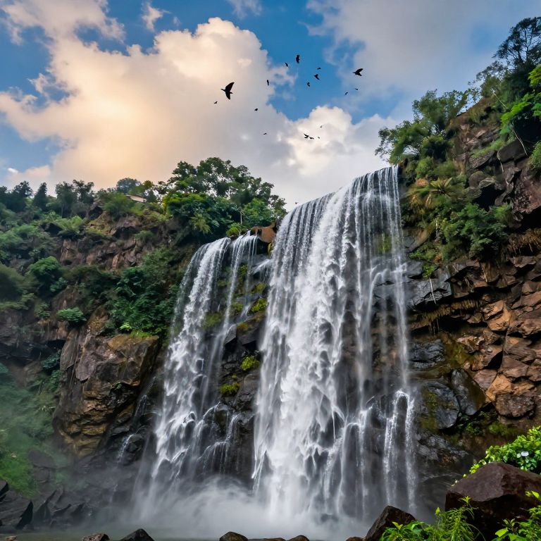 Photograph of a tall, multi-tiered waterfall cascading down a rocky, forested cliff under a bright, partly cloudy sky with flying birds.