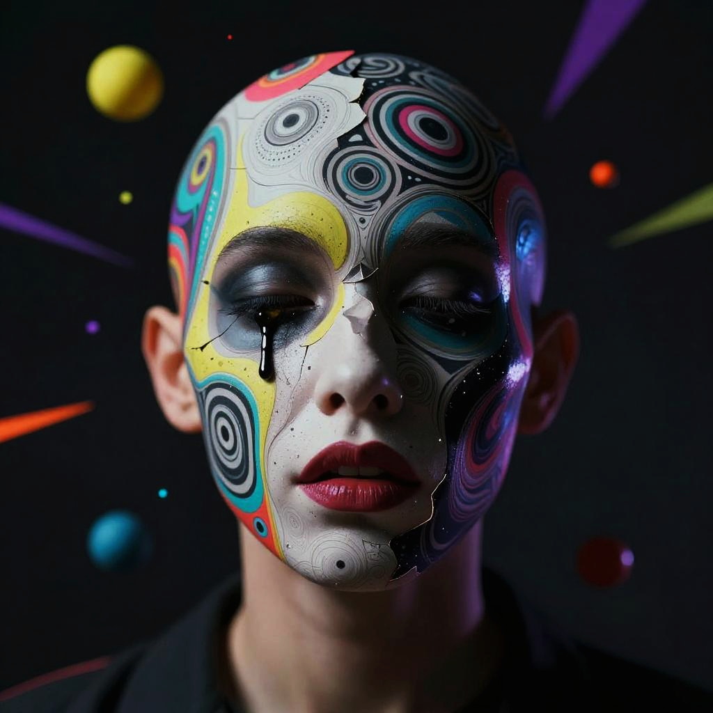 Psicotico scene depicting a fragmented mind, abstract shapes and swirling patterns, bright neon colors mixed with deep blacks, a feeling of mental turmoil and instability, cinematic composition, dynamic lighting effects.