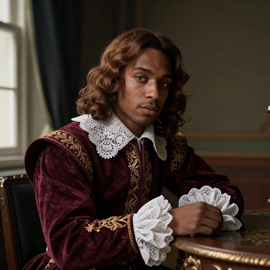 Photograph of a young Black man with long, wavy brown hair, wearing a rich, maroon velvet Renaissance-style doublet with intricate gold embroidery and white lace cuffs and collar. He has a serious expression and is seated at a wooden table, resting his hands on the surface. The background features a dimly lit, elegant room with dark curtains and a window allowing soft light to filter in. The image has a dramatic, historical feel, highlighting the subject's regal attire and solemn demeanor.