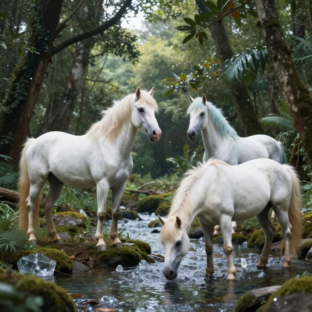 Mythical creatures in the forest, majestic unicorns grazing near crystal-clear streams, ethereal light filtering through thick emerald foliage, dreamy and mystical ambiance