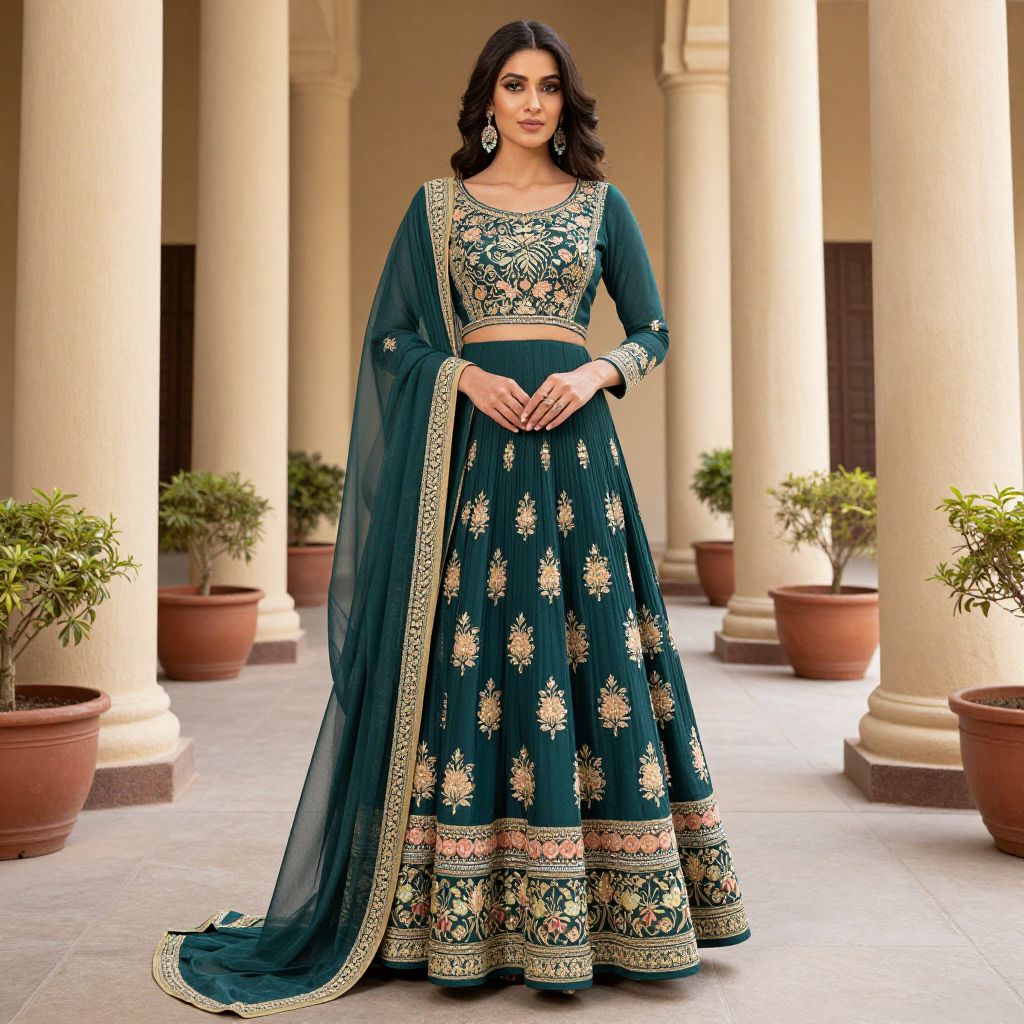 Photograph of a South Asian woman with medium brown skin and dark wavy hair, wearing a teal traditional lehenga with gold embroidery, standing in a