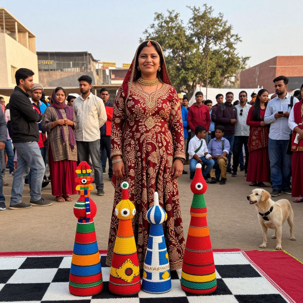 Vibrant traditional chess pieces stand tall in front of a smiling woman, surrounded by a lively crowd and a curious dog at the Winter festival in Mount Abu, Rajasthan, showcasing local art forms and cultural heritage.