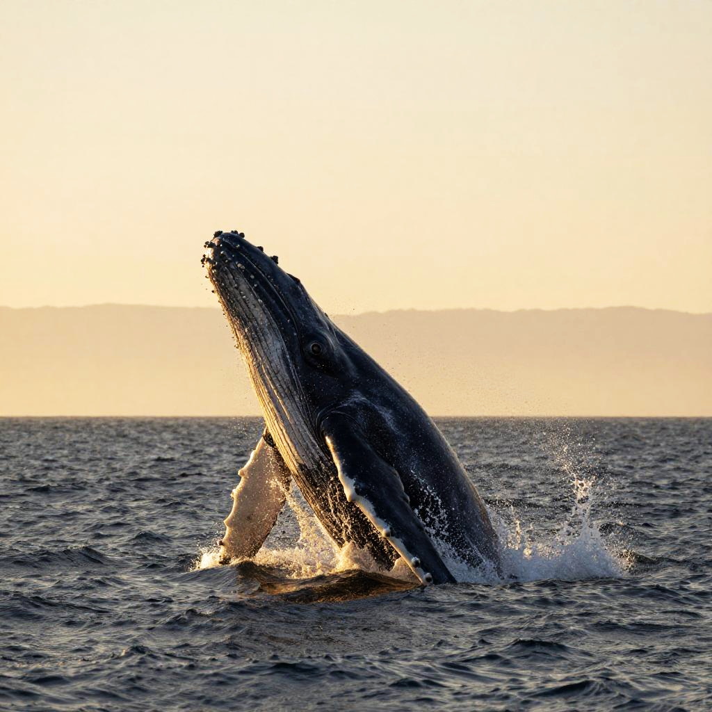 Majestic humpback whale breaching ocean surface on open sea under golden sunrise sky, in cinematic wide-angle wildlife footage; heroic stance, warm rim light, detailed textures and fine fur/skin, expressive eyes, atmospheric perspective, low-angle dramatic view, leading lines, balanced rule-of-thirds composition, soft background separation, high dynamic range feel, ultra sharp subject, natural color grade, subtle haze, microcontrast on edges, immersive realism, SDXL, 8k resolution