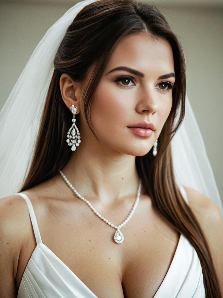 Straight hairstyle bride, 1girl, solo, earrings, breasts, jewelry, realistic, looking at viewer, cleavage, dress, long hair, brown hair, white dress, blurry background, upper body, blurry, closed mouth, hoop earrings, lips, medium breasts