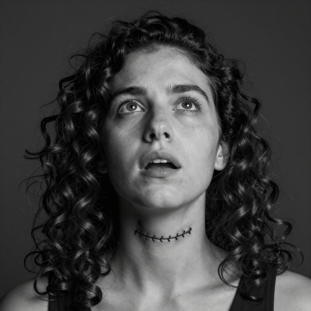 Black and white photograph of a woman with dark curly hair, wide-eyed, and mouth open in shock. She wears a dark garment with a high collar. A dark, rectangular mask covers her nose and upper lip. Background is blurred and dark.