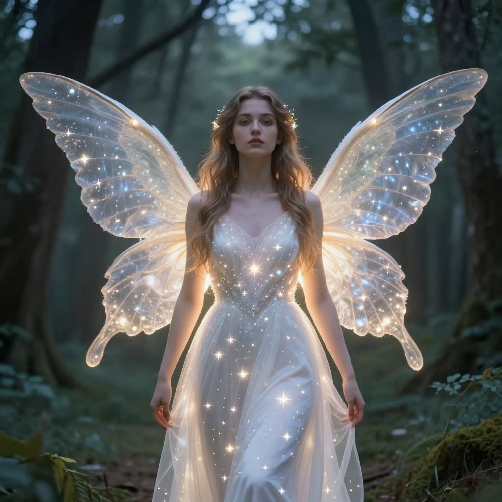 Photograph-like CGI image of a fair-skinned, long-haired woman with glowing ethereal wings, standing in a dense, dark forest. She wears a translucent, white, sleeveless gown with sparkles and holds a balanced scale in each hand. Her wings are adorned with bright, twinkling lights, and a golden crown rests on her head. The forest background is dimly lit, with tall trees and ferns, enhancing the mystical atmosphere. Her serene expression and the luminous elements create a magical, otherworldly effect.