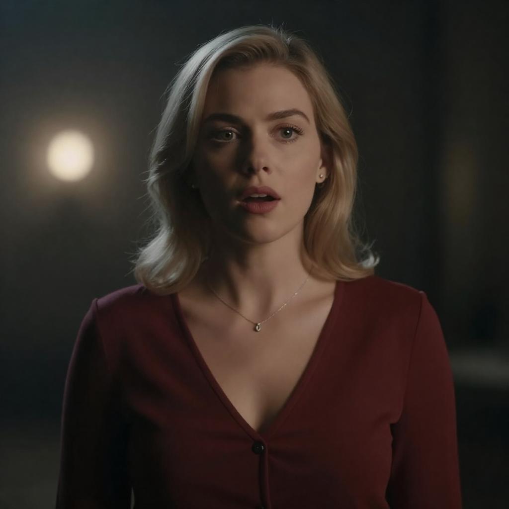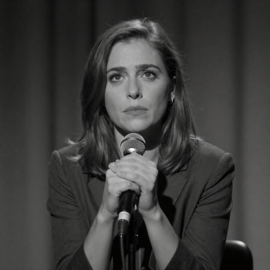 Photograph of a fair-skinned woman with red lipstick and brown hair in an elegant updo, wearing a black blazer over a white top. She stands in front of a vintage microphone with a "LSI" , against a dark background with blurred red lights. Her expression is serious and focused.