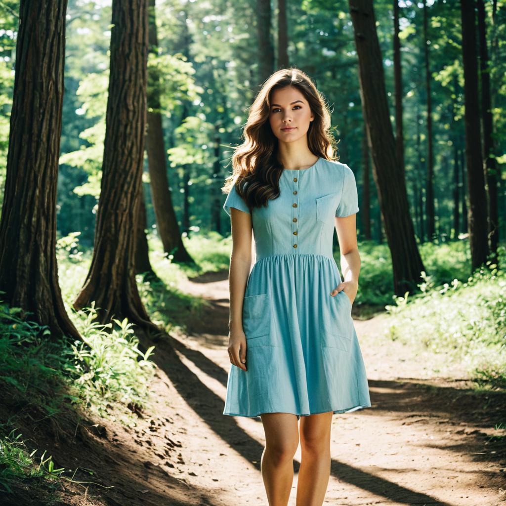 Mod dress, photorealistic, young woman, standing, forest path, summer, light blue dress, short sleeves, A-line skirt, pockets, long brown hair, wavy hair, neutral expression, sunlight filtering through trees, green foliage, dirt path, tall tree trunk on right, serene atmosphere, realistic ures, daytime, casual fashion, natural light