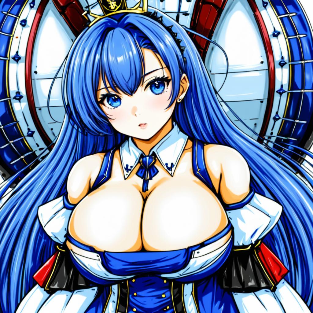 Alsace (azur lane), azur lane, 1girl, blue eyes, blue hair, very long hair, parted bangs, sidelocks, large breasts, huge breasts, cleavage, breast strap, thighs, navel, skindentation, bare shoulders, detached collar, blue ribbon, tiara, black tiara, by artist machismo fuji, anime
