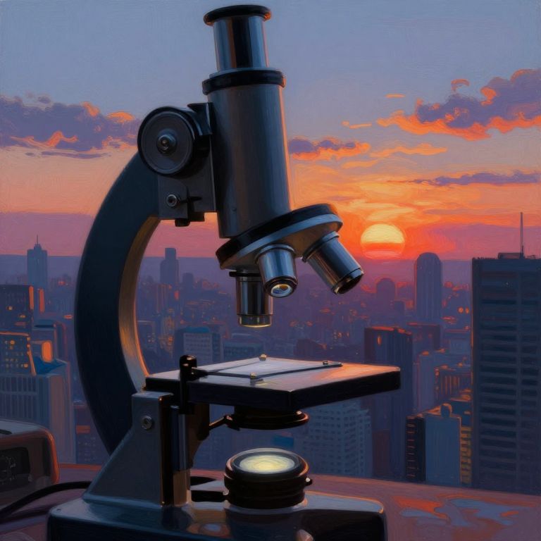 An intricate digital painting capturing a surreal futuristic cityscape at twilight through the eyepiece of an antiquated microscope, distorting and magnifying the urban landscape into psychedelic patterns. The setting sun's vibrant colors blend with these distorted shapes, evoking feelings of awe and confusion as the viewer navigates this strange world. This piece reflects a unique fusion of surrealism and microscopic perspective, creating a visually stunning and thought-provoking scene.