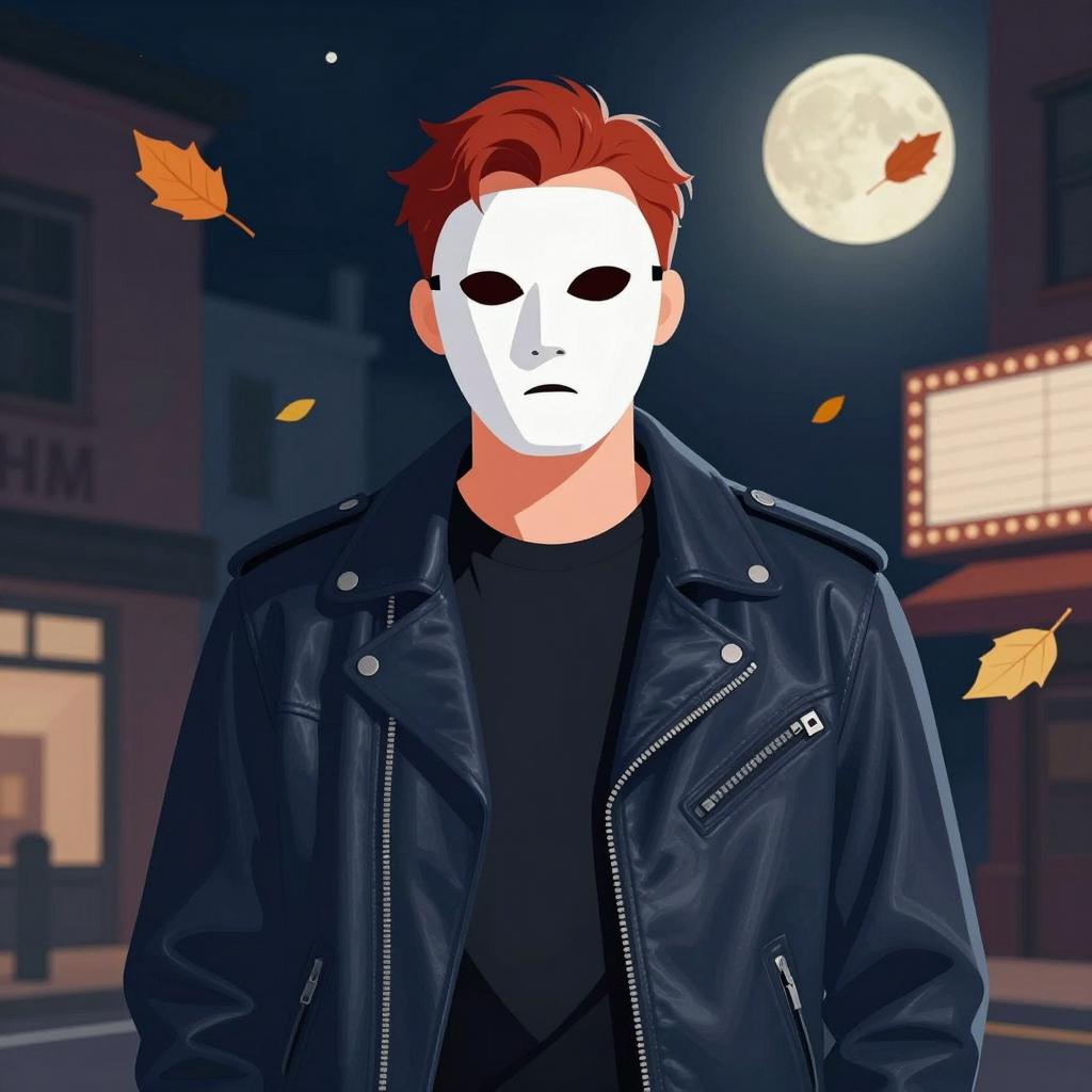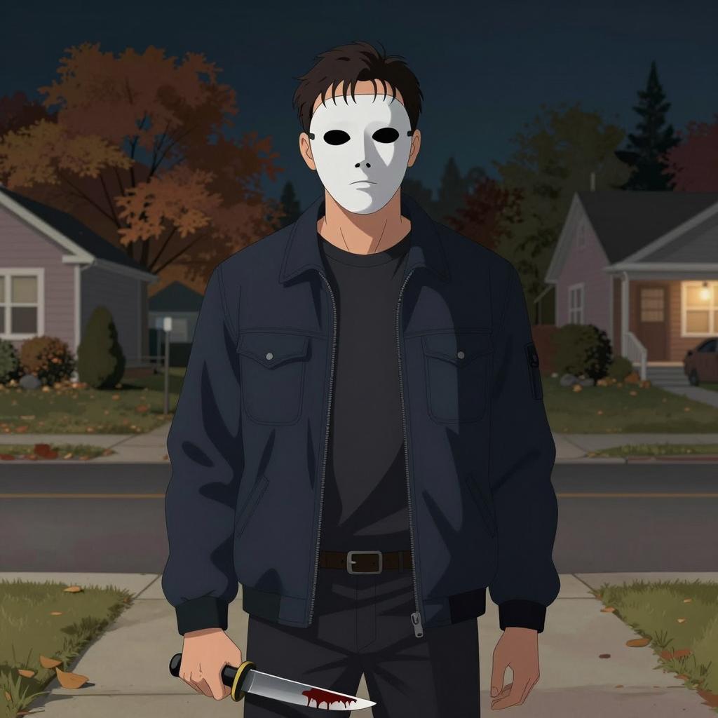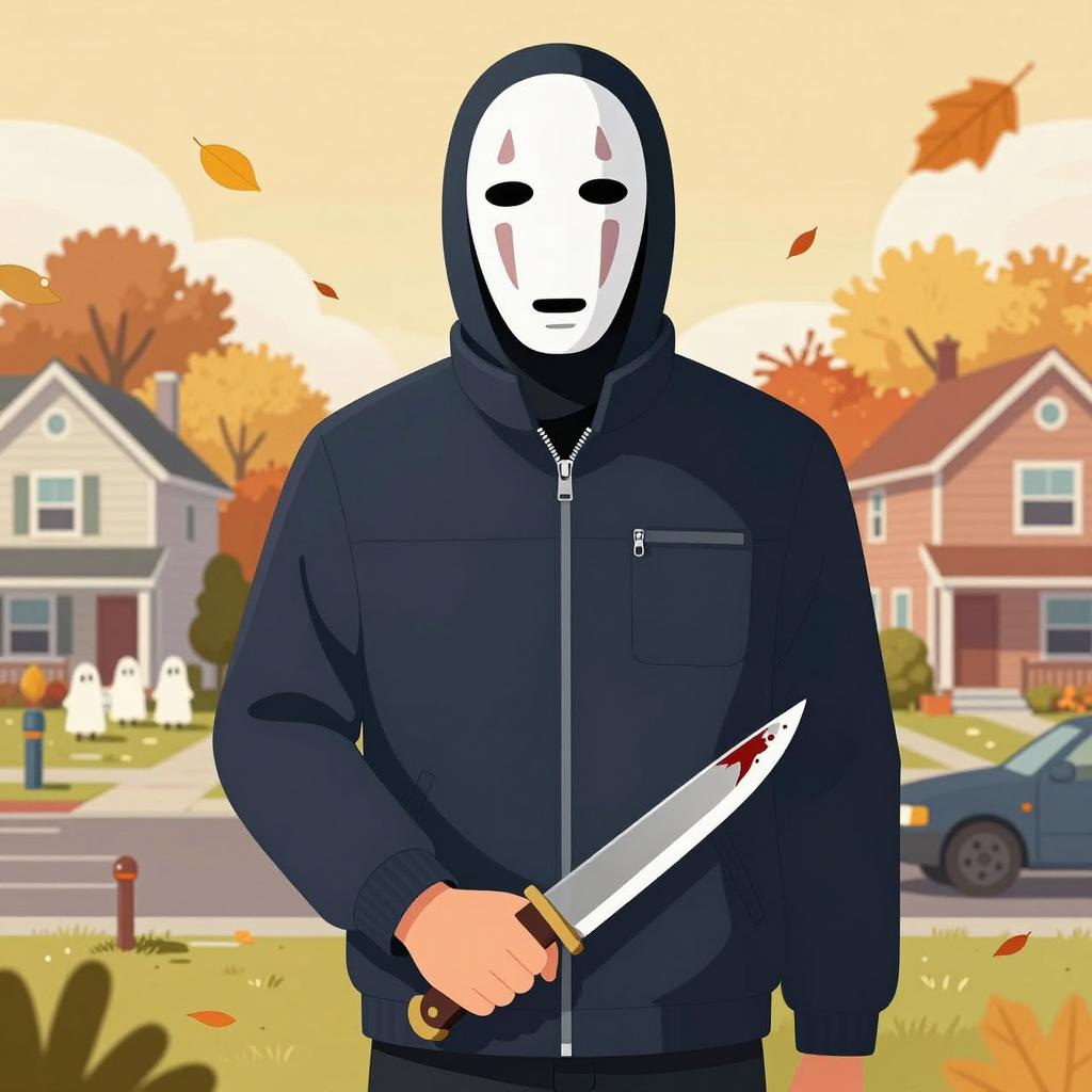 Illustration of a male figure with a white, blank-faced mask, wearing a dark blue zip-up jacket, holding a knife with a bloodstained blade. Autumn leaves float around. Background includes a suburban neighborhood with houses, a bridge, and a car. Several small, ghost-like figures stand in front of the houses. Bright, warm colors dominate the scene.