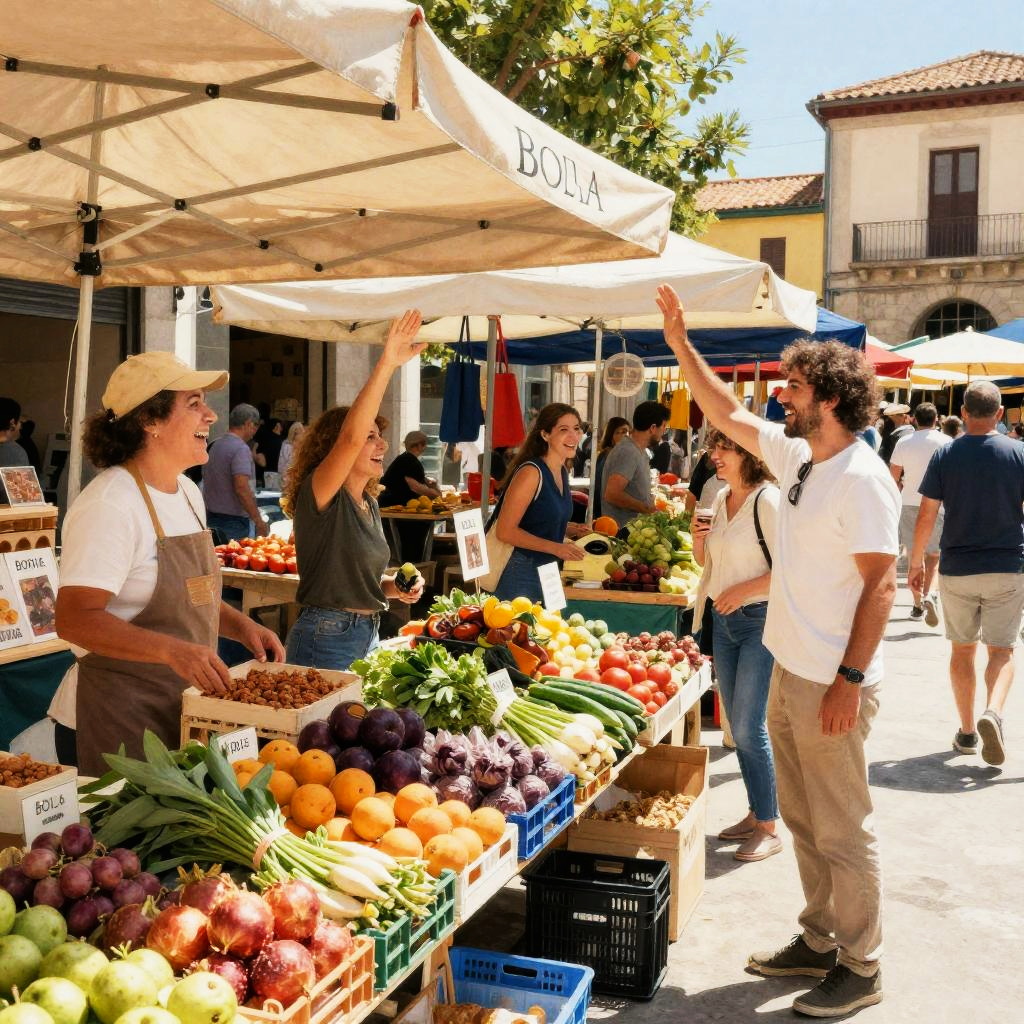 A joyful market scene showcasing greetings in Catalan, vendors and locals cheerfully saying 'Bon dia' and 'Hola', fresh produce and handmade crafts under bright sunny skies, rich textures and lively expressions, watercolor painting style.
