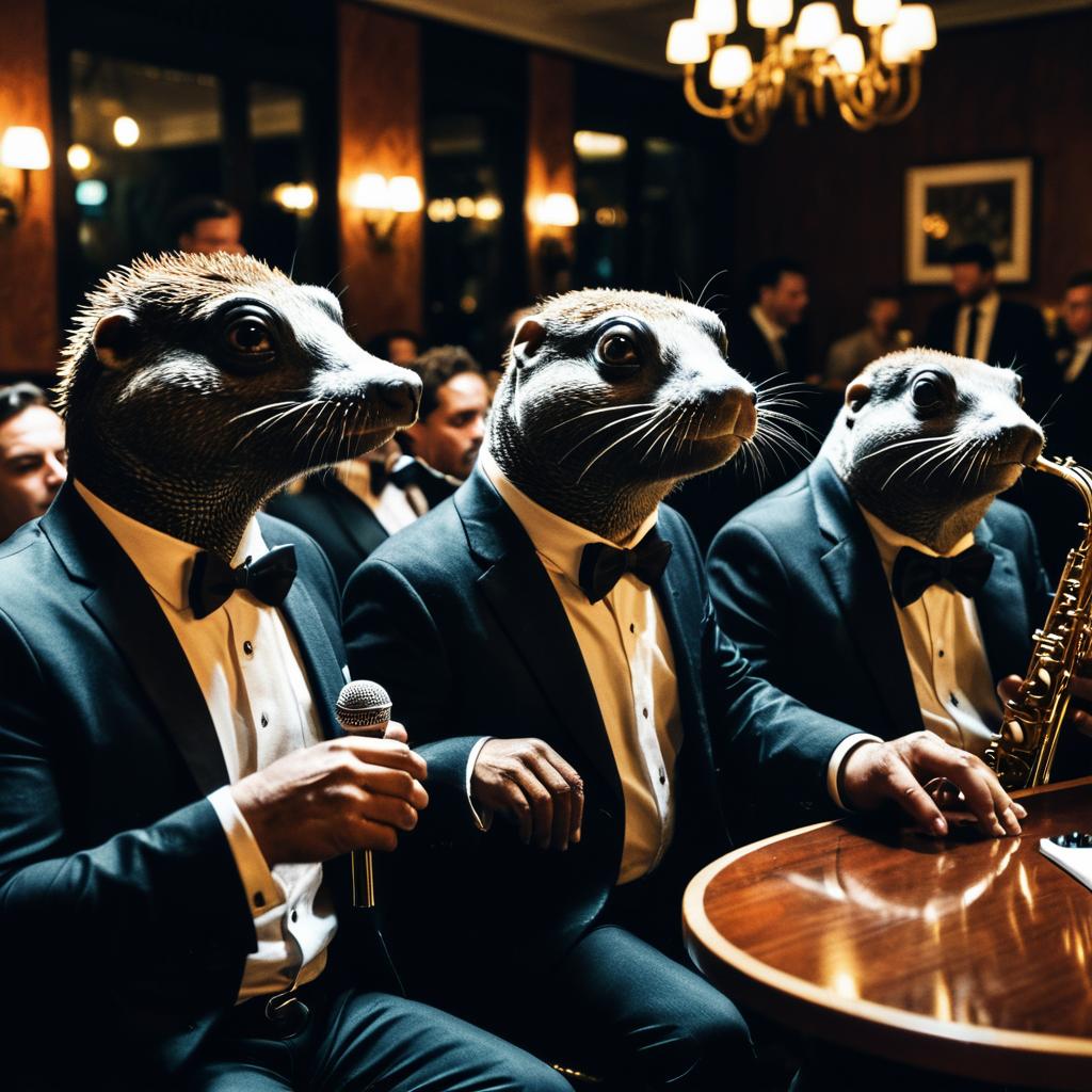 Portrait of four platypuses performing a jazz concert, in a fancy restaurant surrounded by paparazzi, drunk and dumbfounded expressions. Cinematic ultra-realism, intricate lighting and shadow, hyper-detailed editorial style, RTX-rendered UHD, HDR high-definition.