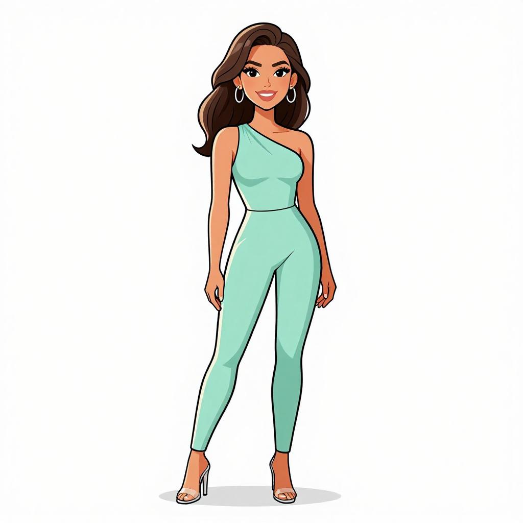 Woman with pretty face and pretty hair. smiling Woman, chic, navy blue jumpsuit, sleeveless, V-neckline, fitted waist with broad metallic belt, slim-fit trousers, ankle length, paired with light-colored stiletto heels. --sref 1467