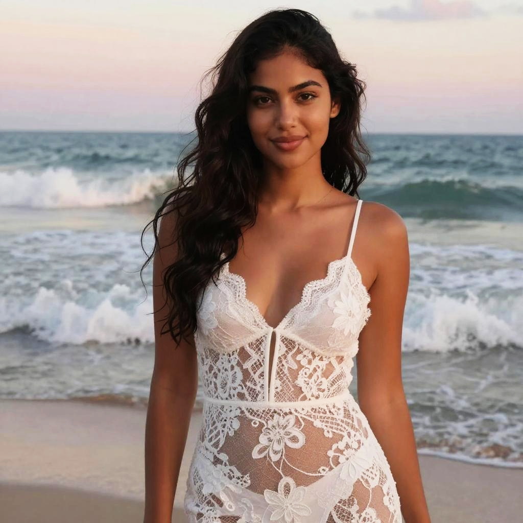 Photograph of a young woman with long, wavy dark hair standing on a beach at sunset. She has a warm, medium-brown skin tone and is wearing a white, lace, spaghetti-strap dress with a deep V-neck. The dress is semi-sheer, showing a hint of her skin through the intricate floral patterns. The ocean waves are gently crashing in the background, and the sky is painted with soft pink and orange hues. She has a subtle smile and is looking directly at the camera.