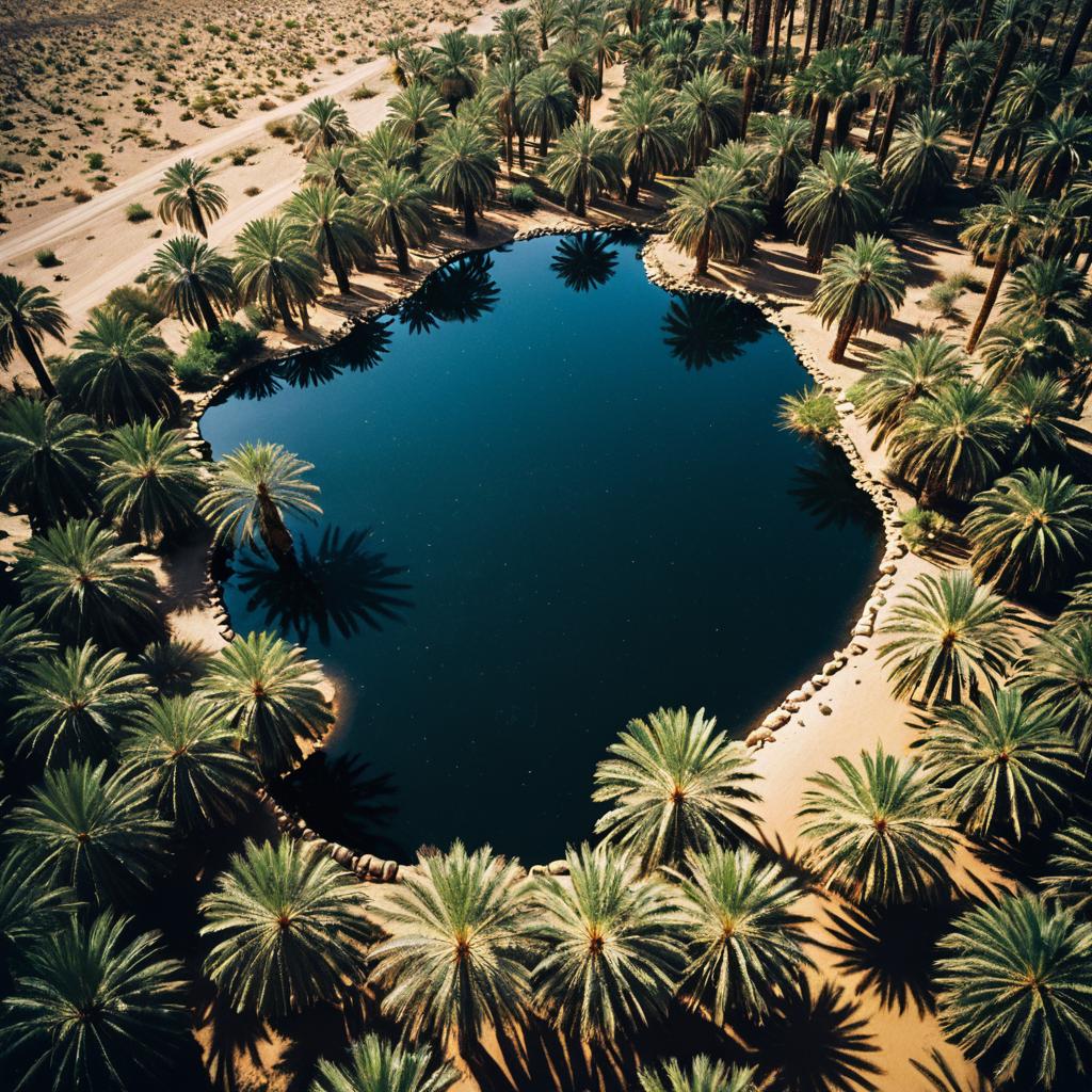 An desert oasis, viewed from above. palm groves, reflective water pools.
