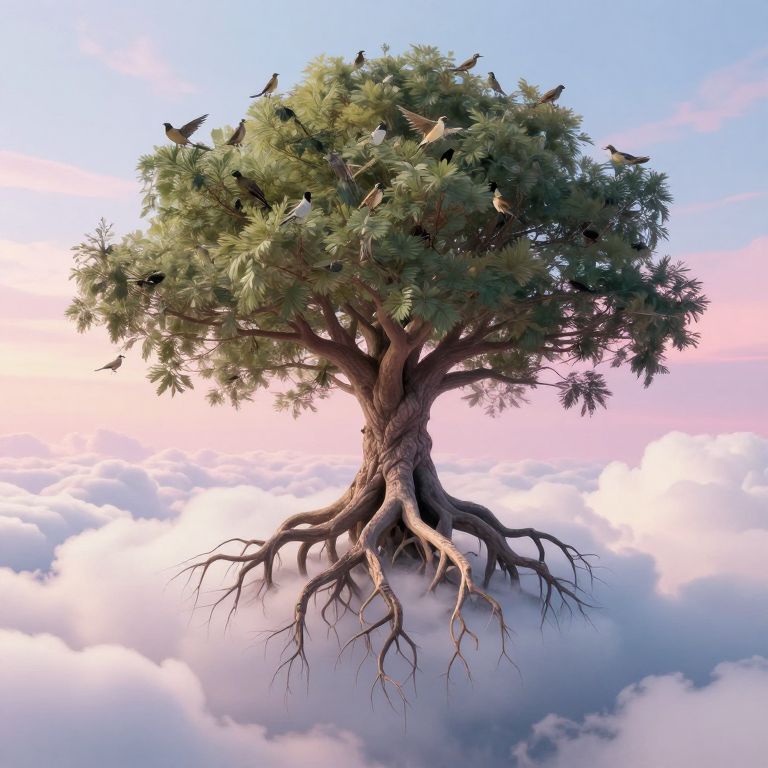 A surreal digital artwork depicts an otherworldly tree with its roots extending downward into the clouds, defying gravity as birds perch on its branches against a dreamy sky rendered in soft pastel hues, evoking a fantastical and ethereal atmosphere.