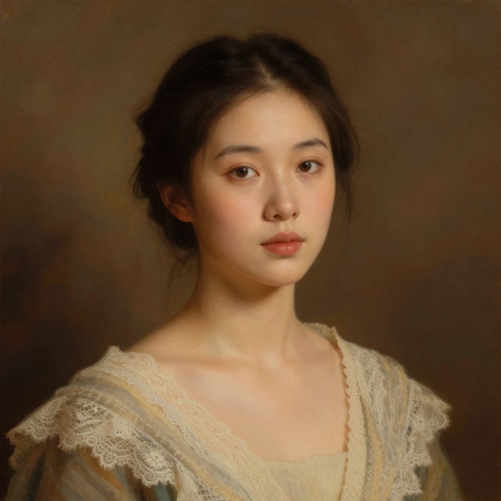 This is a realistic, digital portrait of an East Asian woman with fair skin and delicate features. She has dark, straight hair pulled back loosely, revealing her soft, round face. Her brown eyes are gently looking forward, and her lips are slightly parted. She wears a lace-trimmed, beige dress with a square neckline. The background is a warm, brown gradient, highlighting her face and dress. The image has a classical painting style, with smooth textures and subtle lighting that accentuates her natural beauty.