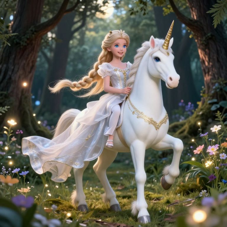 A realistically rendered photograph of a young fairy-tale princess in a majestic unicorn princess dress, flowing white and silver with golden embroidery, standing in a enchanted forest at sunset, surrounded by glowing wildflowers and soft moonlight filtering through the trees; she has long, flowing braided hair, bright blue eyes, and a gentle, smiling expression, wearing delicate silver heels and holding a tiny crystal wand