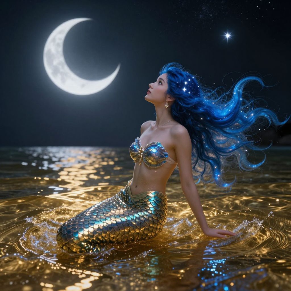 Photograph-like CGI of a mermaid with long, flowing blue hair, illuminated by moonlight. She has a shimmering gold-scale tail and a matching gold-scale top. She is kneeling in golden, rippling water, gazing up at a bright crescent moon in a dark, star-speckled sky. Her expression is serene and dreamy. The water reflects the moon's light, creating a magical, ethereal ambiance. Her hair has a sparkling effect, adding to the fantasy theme. The overall color palette includes deep blues, golds, and black, enhancing the mystical, underwater setting.