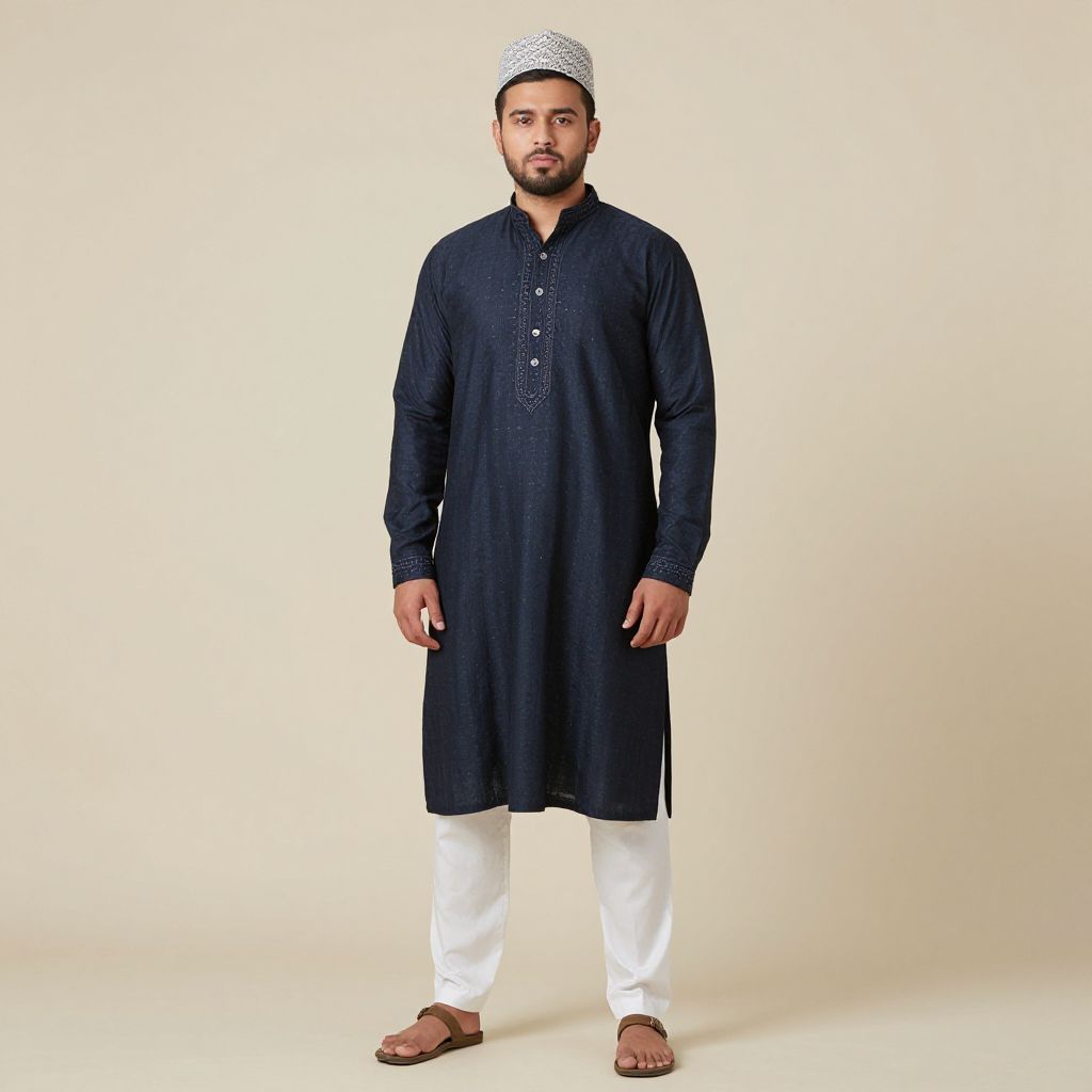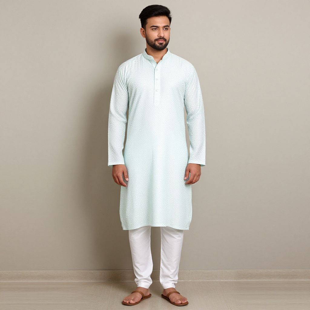 "Wedding Party Wear Kurta Man, a man in a white and gold shirt standing in front of a wall"