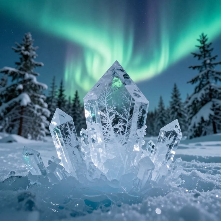 Photograph of glowing, intricate ice crystal cluster with snowflake patterns, set in a snowy forest under a vibrant green aurora borealis night sky.