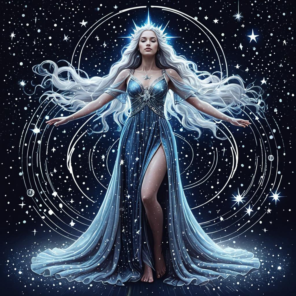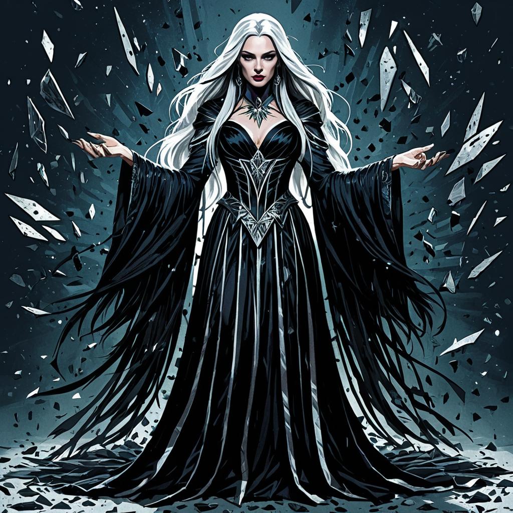 Illustration in pop art style of a noble ice sorceress, full body image, with long braided white hair with icy blue tips, wearing crystal-embellished sapphire gown. The character is magically controlling and enchanting frosty snowflakes that dance around her, with dark magic flowing from her fingertips, rendered with vibrant, bold visuals.