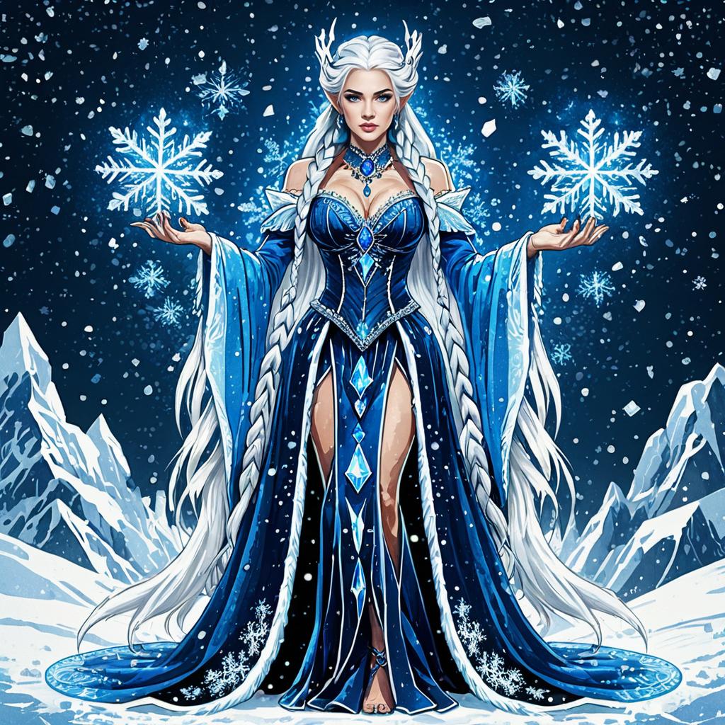 Illustration of a noble ice sorceress with long braided white hair featuring icy blue tips. She is wearing an elaborate sapphire blue gown adorned with crystal embellishments. The sorceress is magically controlling large, glowing snowflakes with dark magic flowing from her fingertips. The background depicts a snowy mountain landscape with falling snow, rendered in vibrant pop art style.