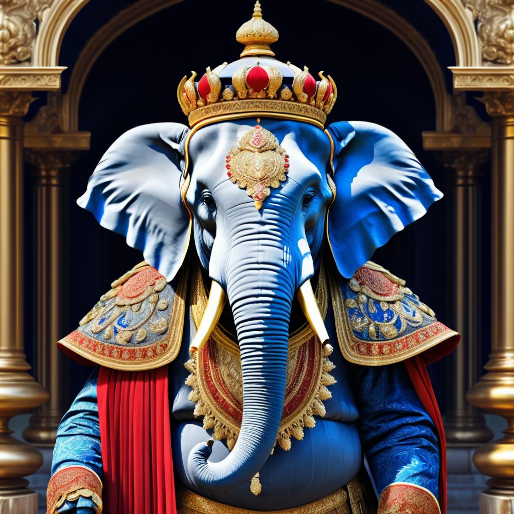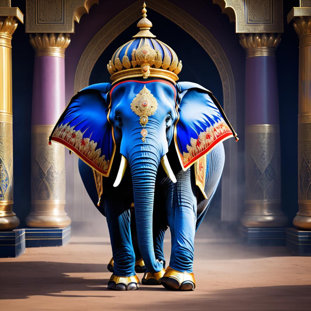 A digitally painted blue elephant dressed as a royal guard adorned with an ornate golden crown and richly detailed blue and gold ceremonial garments standing in an elegant palace corridor with golden and purple pillars.