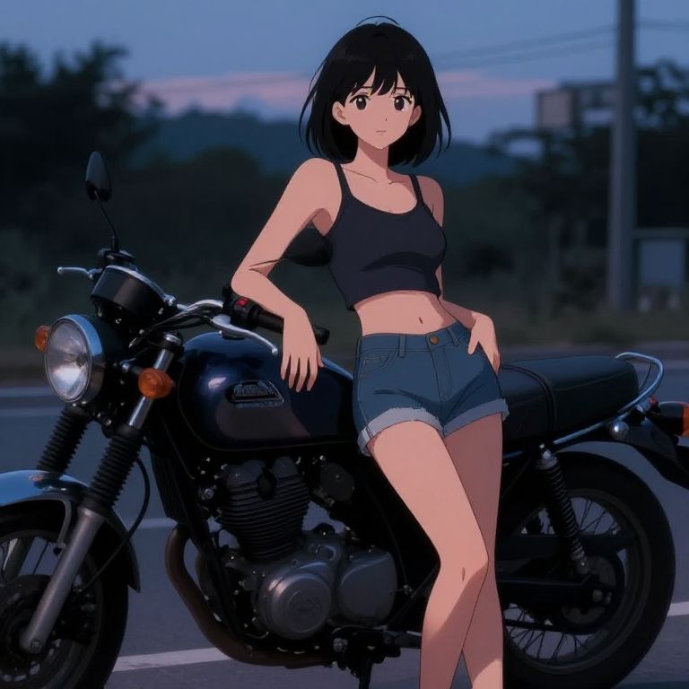 Anime girl in shorts and crop top leaning against a vintage motorcycle at dusk, moody lighting, detailed textures, cool street atmosphere, confident and relaxed pose