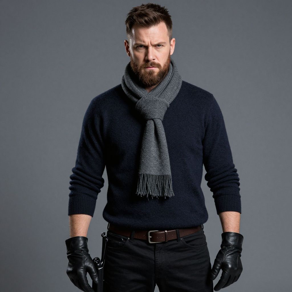 Photograph of a muscular Caucasian man with a full beard and short, dark brown hair, standing against a plain gray background. He wears a dark navy sweater, a thick gray scarf around his neck, black leather gloves, and black pants with a brown belt. His expression is serious and intense, with a focused gaze directed at the camera. The lighting is even, highlighting his strong jawline and the texture of his sweater and gloves. The overall style is modern and somewhat edgy, with a subtle hint of ruggedness.