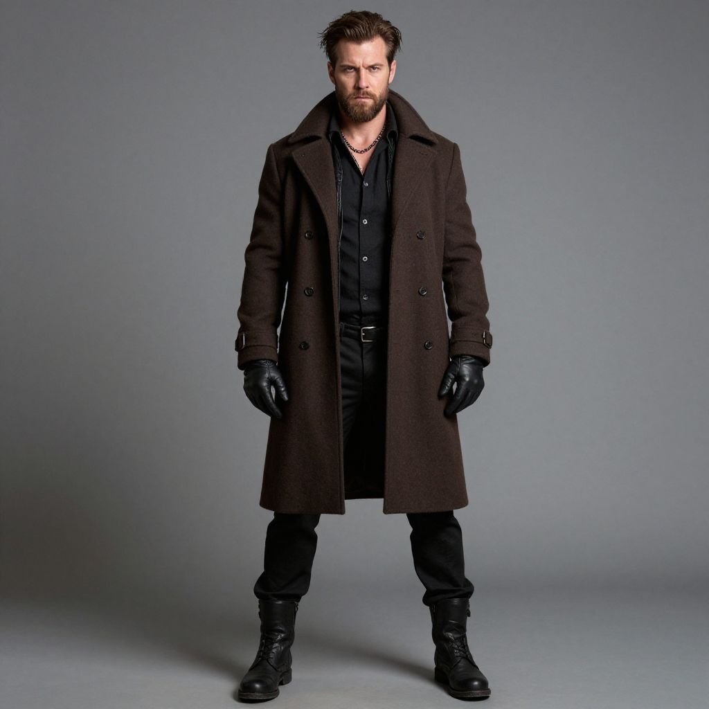 Photograph of a serious-looking, bearded man with short brown hair standing against a plain gray background. He's wearing a dark navy sweater, thick gray scarf, black leather gloves, and black pants with a brown belt. His right hand, partially visible, has a black gun holster attached. His intense gaze and slightly furrowed brows give him a tough, determined vibe.